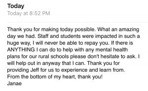 For instance, I was called upon to assist a Community in Crisis in Woodstock, Canada, where they had tragically experienced five teen suicides in a single week. In Alaska, I worked with a community grappling with 18 suicides in 18 months, while in Indiana, I addressed the devastating toll of nine suicides within a year, including four in just six weeks. In North Dakota, I offered support after a combination of suicide and a tragic car accident claimed the lives of two teenagers in a small school.