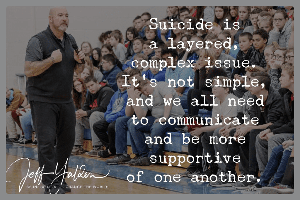 Mr. Jeff Yalden delivered the most powerful, influential, motivating, and emotional address to our approximate 800 high school students I have witnessed in my eight years of high school teaching. If Jeff paused for a moment, you could hear the sound of silence as everyone was all ears to hear what was next. At the end of his presentation kids were giving him handshakes and hugs with both tears and smiles!